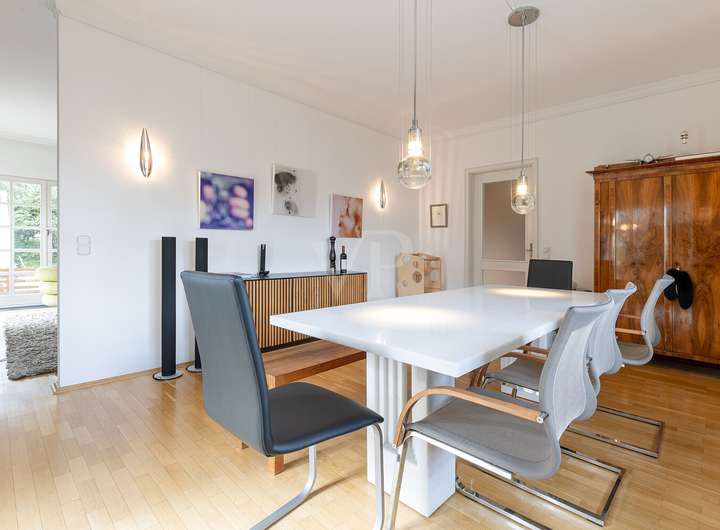Der Grundriss entfaltet einen lichtdurchfluteten Wohn- und Essbereich, der durch bodentiefe Fensterelemente ein freundliches, einladendes Raumklima schafft. Die großzügig dimensionierte Flügeltür öffnet den Zugang zu diesem zentralen Lebensmittelpunkt und ermöglicht einen harmonischen Übergang. Hohe Decken, kunstvoller Deckenstuck im Erdgeschoss und der offene Kamin sowie hochwertiger Parkettböden tragen zur Exklusivität des Interieurs bei.