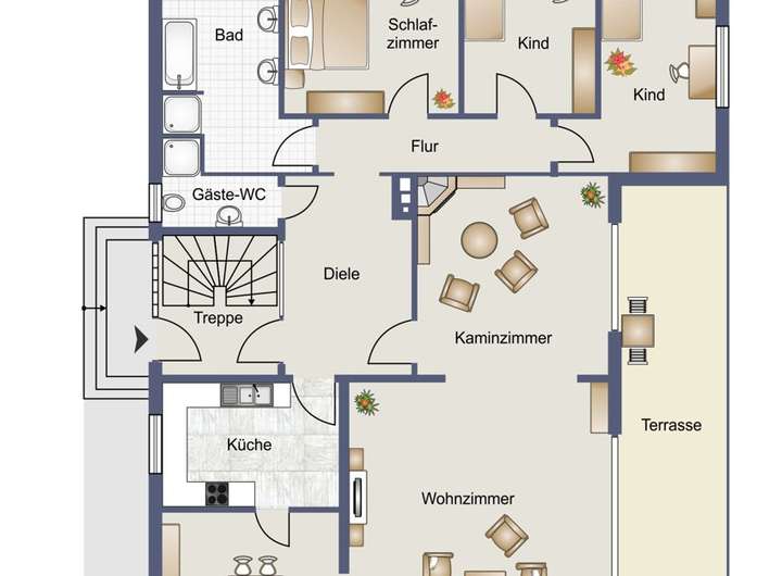Die ca. 175 m² teilen sich auf in: Diele, Küche, Esszimmer, Wohnzimmer, Kaminzimmer sowie 3 im „Schlaftrakt“ gelegene, als Schlaf-/Gäste-/Bürozimmer nutzbare, Räume.