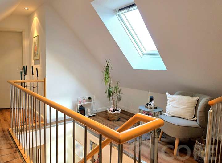 Der durchdachte Grundriss mit ca. 180 m² (inkl. ca. 35 m² Spitzboden) bietet 5 Zimmer, Küche, Diele, Vollbad und Gäste-WC. Der helle Balkon und die charmanten Schrägen schaffen eine besonders gemütliche Atmosphäre. Über die geschwungene Holztreppe gelangen Sie in den Spitzboden mit Schlafzimmer, begehbarem Kleiderschrank, Abstellraum und einer Empore zum Entspannen.