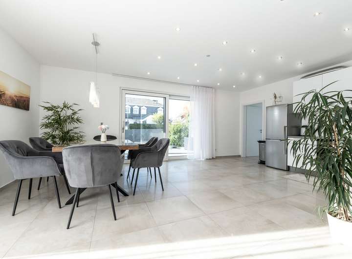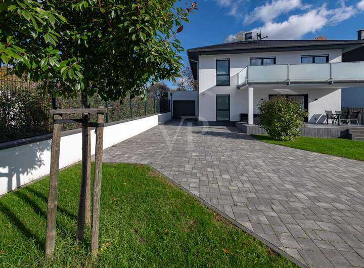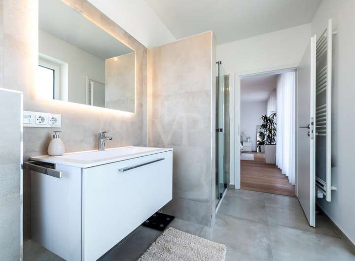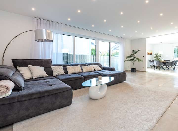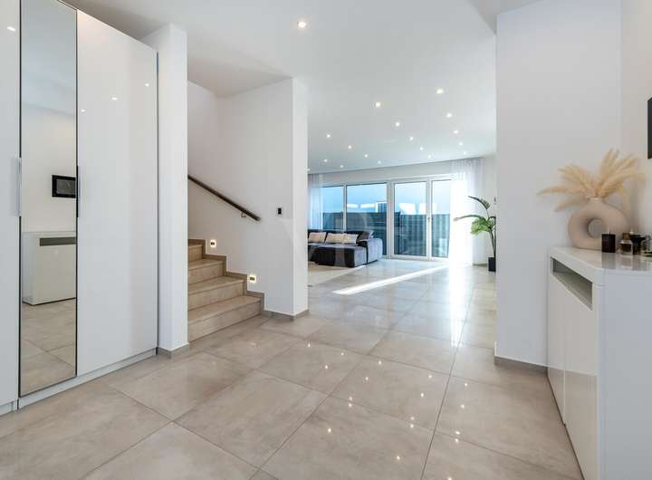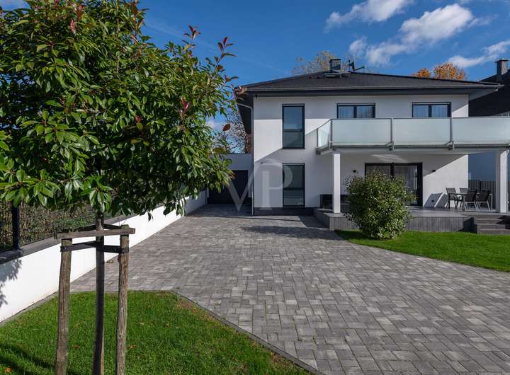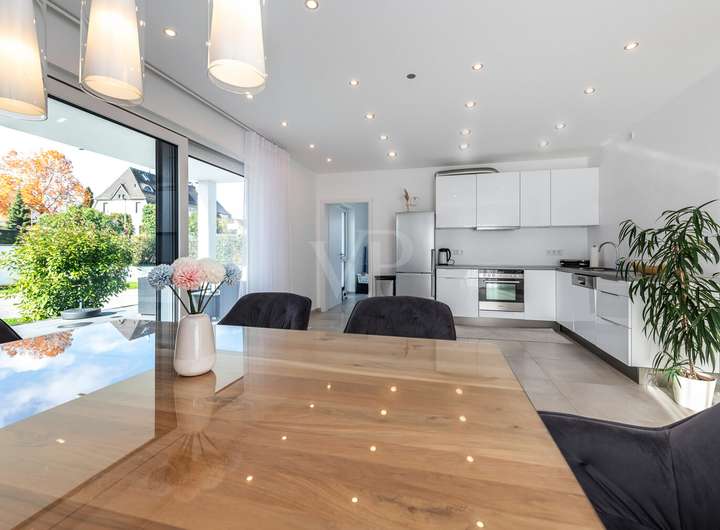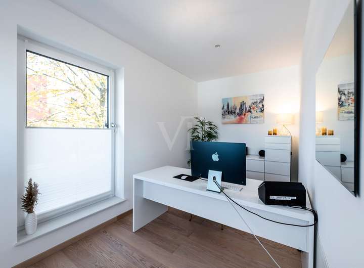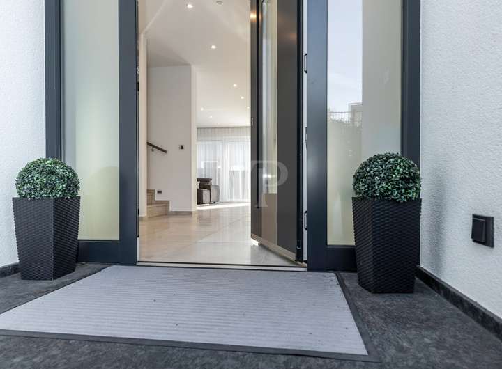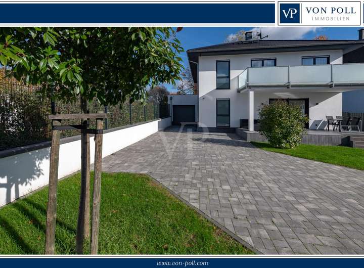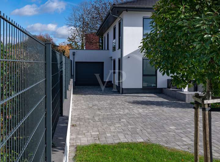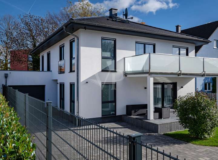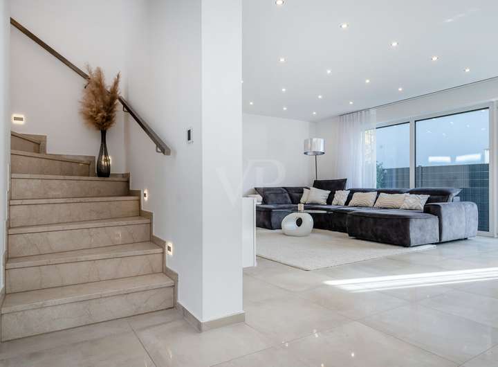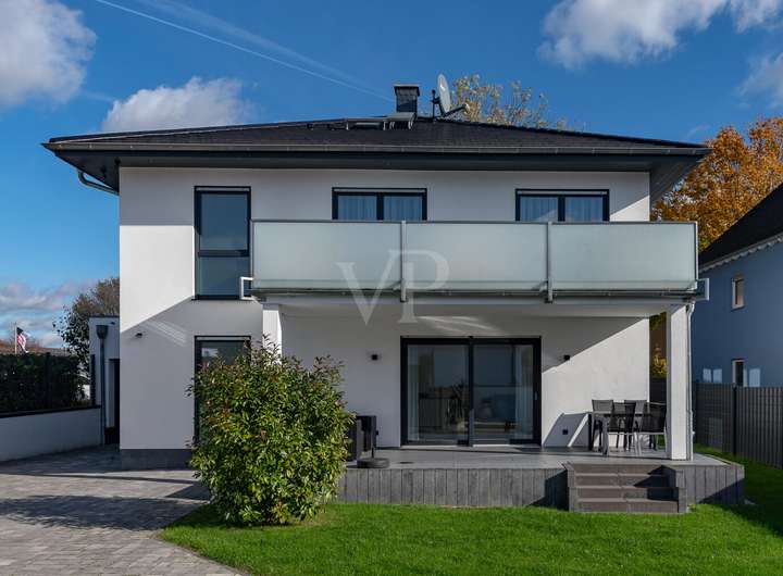 Der großzügig gestaltete Wohnbereich im EG mit angrenzendem offenen Essbereich und integrierter Küche vermittelt ein helles, modernes Wohngefühl. Technische Raffinessen und eine erstklassige Ausstattung prägen das gesamte Haus: Dreifachverglasung, Fußbodenheizung, eine effiziente Wärmepumpe, Netzwerkanschlüsse in allen Räumen und ein Smart-Home-System setzen höchste Wohnstandards.