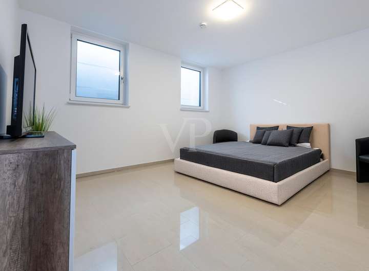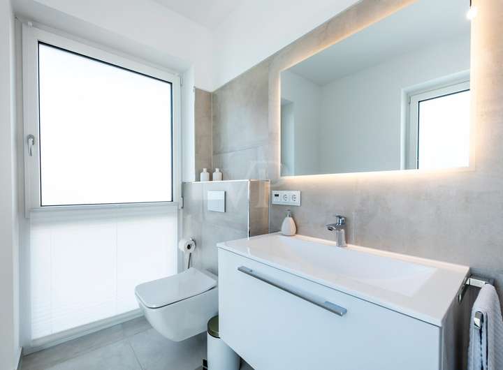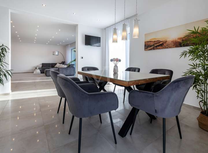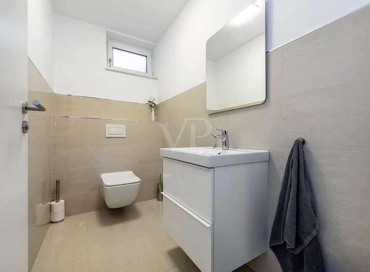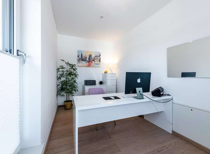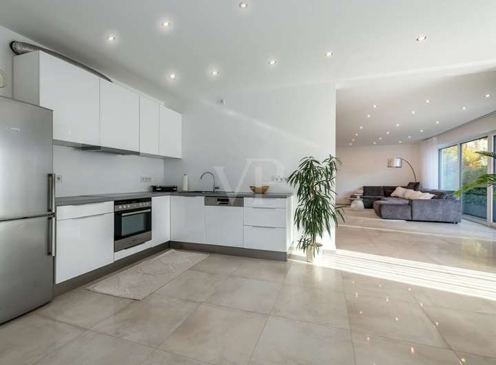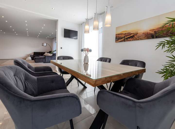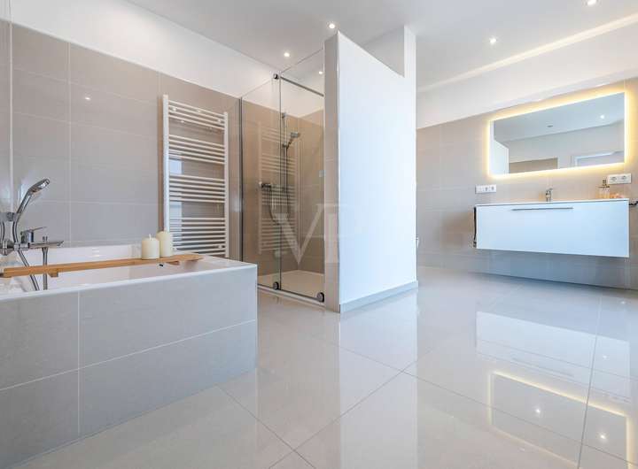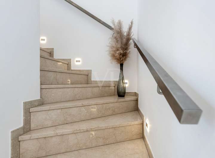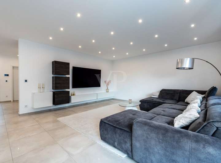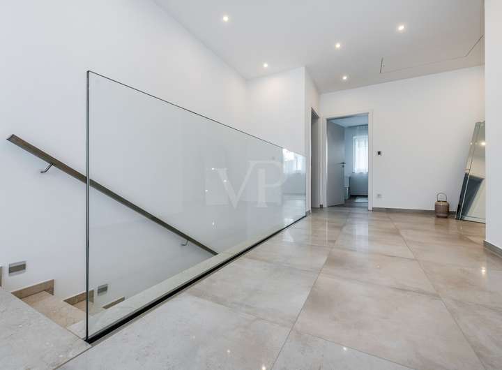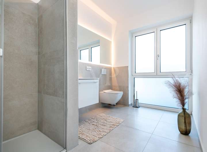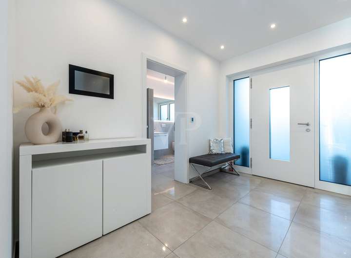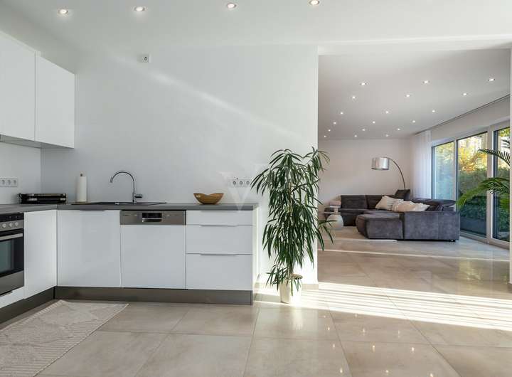 Der großzügig gestaltete Wohnbereich im EG mit angrenzendem offenen Essbereich und integrierter Küche vermittelt ein helles, modernes Wohngefühl. Technische Raffinessen und eine erstklassige Ausstattung prägen das gesamte Haus: Dreifachverglasung, Fußbodenheizung, eine effiziente Wärmepumpe, Netzwerkanschlüsse in allen Räumen und ein Smart-Home-System setzen höchste Wohnstandards.