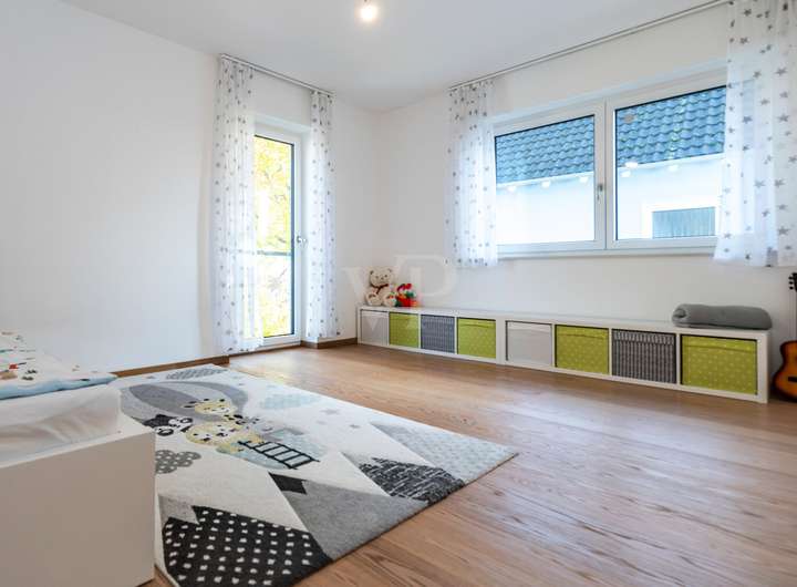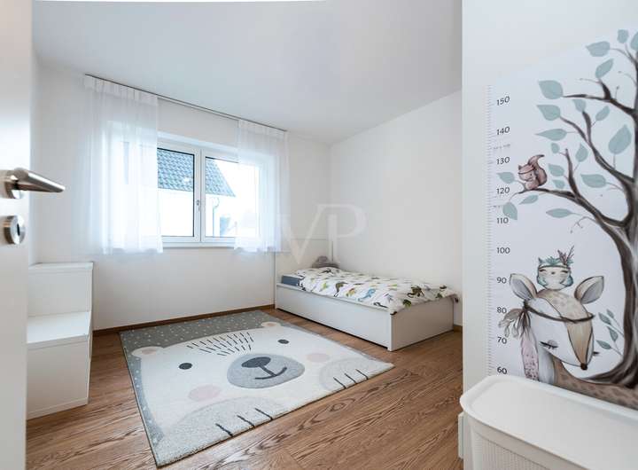 Im Obergeschoss wird das Raumangebot ergänzt durch ein Ankleide-/ Gäste- oder Arbeitszimmer und zwei helle, große Kinderzimmer mit gemeinsamen Tageslichtbad.