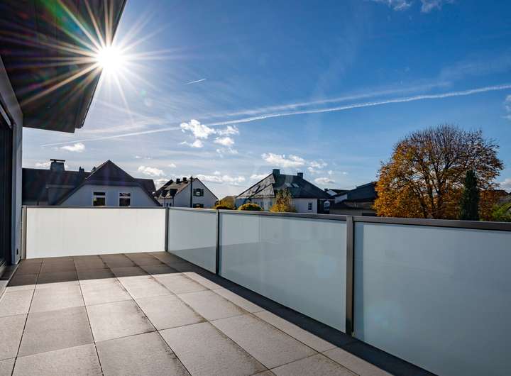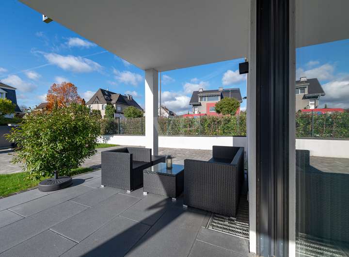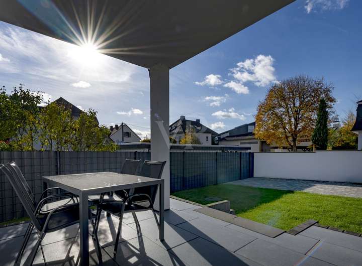 Eine weitläufige Sonnenterrasse erweitert den Wohnraum im Sommer und schafft Raum für Entspannung und Erholung in naturnaher Umgebung.