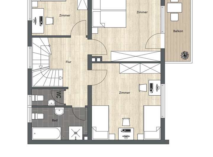 Im Erdgeschoss, mit Küche, Esszimmer, Wohnzimmer und Toilette spielt sich der Alltag ab. In OG und DG befinden sich die Kinderzimmer bzw. Schlafzimmer, welche eine ansprechende Größe mitbringen, sowie die Badezimmer.