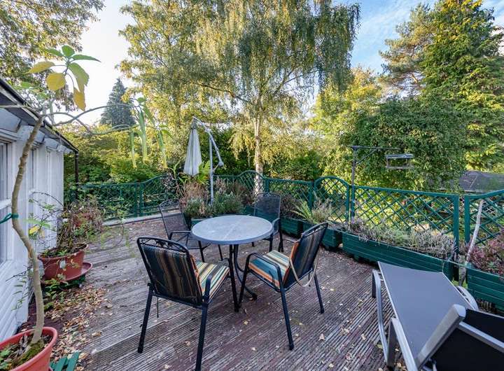 Der weitläufige Gartenbereich schafft reizvolle Aufenthaltsorte im Freien. Besonders der Bereich am Wintergarten lädt zu geselligen Stunden im Sommer ein, während der geschützte Garten hinter dem Haus Ruhe und Erholung verspricht.