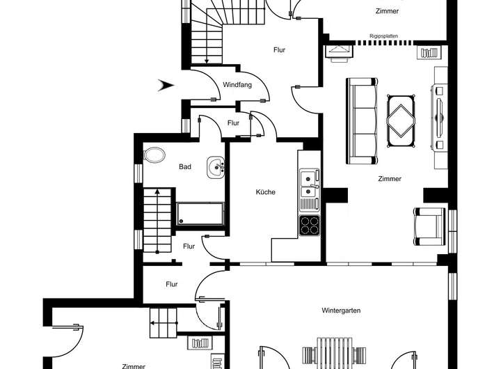 Das Erdgeschoss bietet, verteilt auf vier Zimmer, ein großzügiges Raumgefühl mit weitläufigem Wohn- und Essbereich, der durch hohe Fensterfronten von Licht durchflutet wird. Optional ließe sich dieser mit minimalem Aufwand durch das Öffnen des Nebenraumes, welcher nachträglich durch Rigispsplatten separiert wurde, noch erweitern. Die Ebene wird durch ein stilvolles Duschbad, eine funktionale Küche, ein Entrée sowie einen im Zuge des Anbaus aus 1995 konzipierten Wintergarten abgerundet.