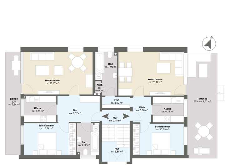 Hervorzuheben ist, dass jede Wohnung über einen großzügigen Balkon verfügt.