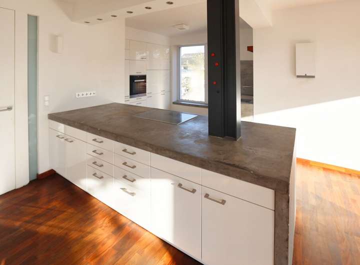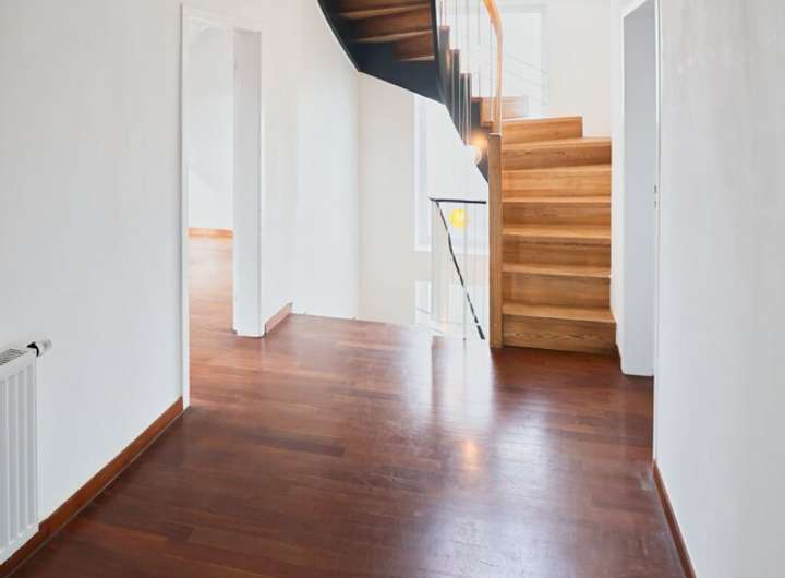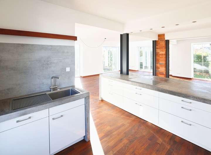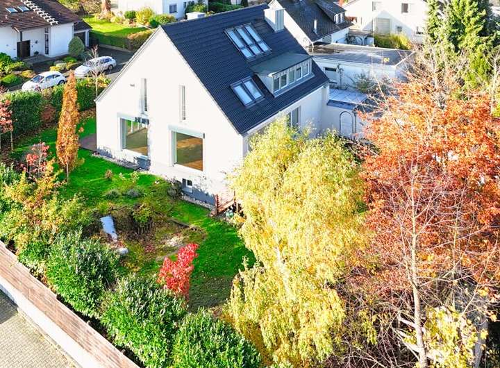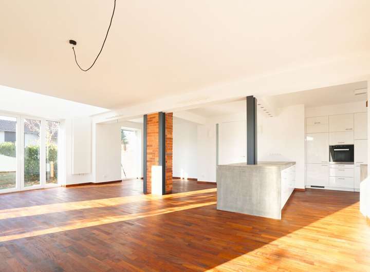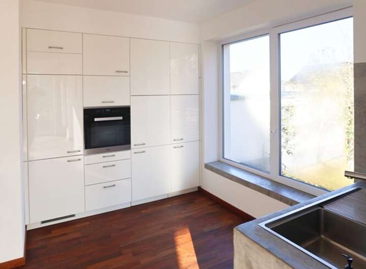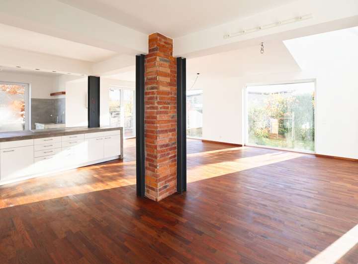 Der offen gehaltene Wohn-Koch-Essbereich im Erdgeschoss ist mit einer modernen Einbauküche ausgestattet. Geschmackvolles Hartholzparkett-Cumaru und große, bodentiefe Fensterfronten, die Zugang zur gemütlich angelegten Terrasse und Garten bieten, lassen den großzügig bemessenen Raum hell und einladend wirken.
