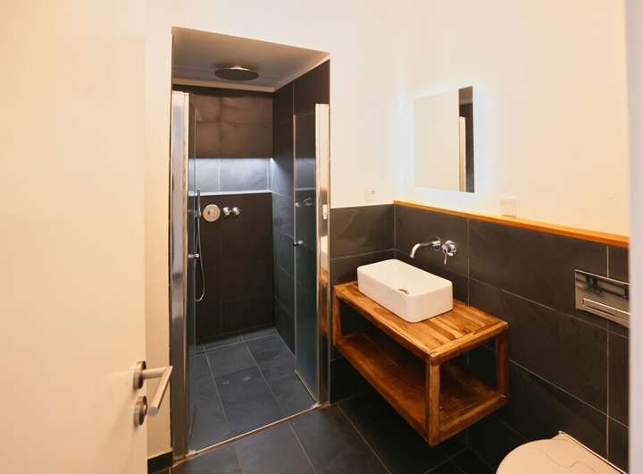 Auf der gleichen Etage befindet sich ein kleines Gästebad mit WC und bodengleicher Dusche sowie ein kleiner Raum, perfekt für eine Garderobe.