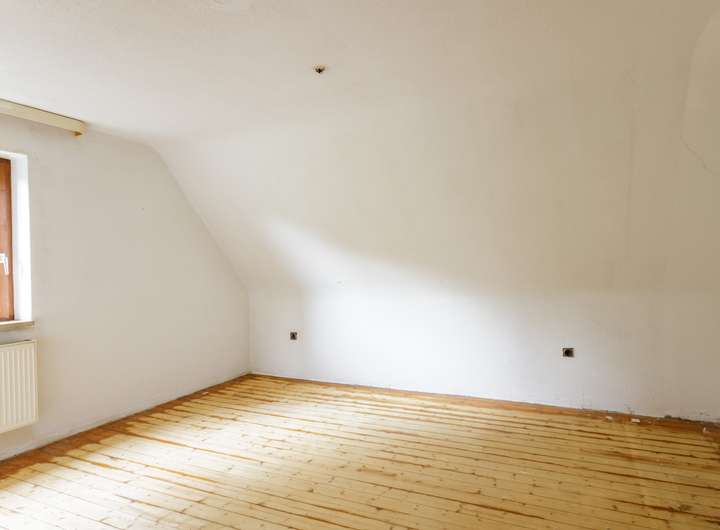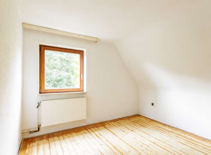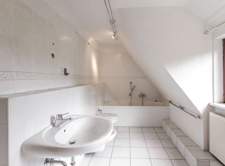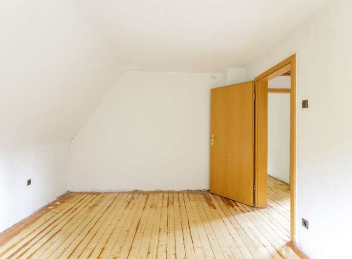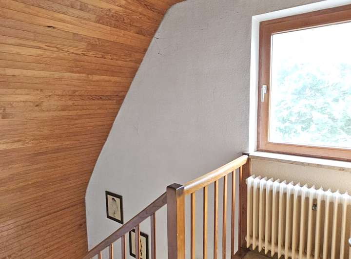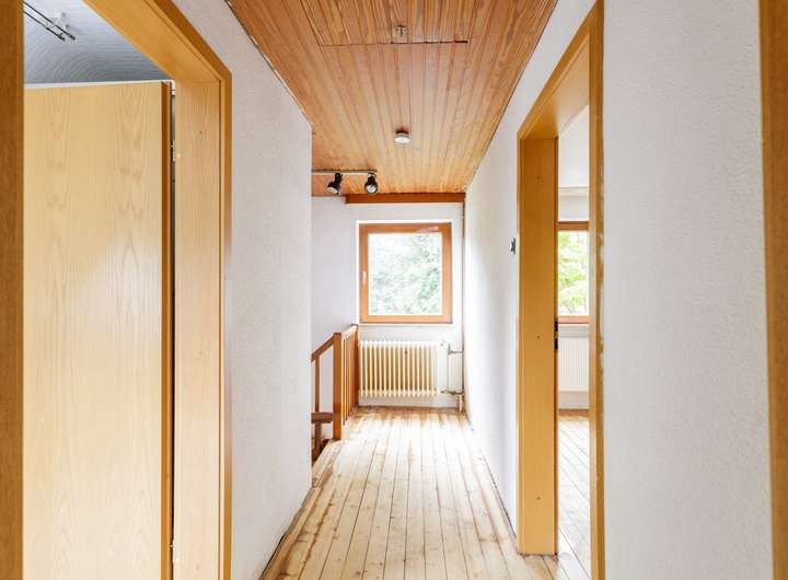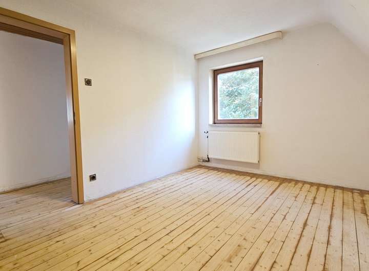 Direkt vom Eingang gelangen Sie ins Obergeschoss, wo sich aktuell zwei Schlafzimmer sowie ein geräumiges Badezimmer befinden. Aufgrund des hohen bisher ungenutzten Spitzbodens besteht hier Ausbaupotenzial.