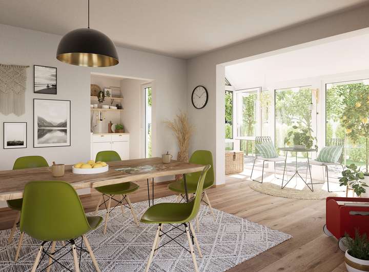 Das großzügige Haus mit dem schönen Satteldach überzeugt mit viel Platz und einem variablen Grundriss. Das Wohnzimmer schenkt genügend Raum zur Erholung, die sich anfügende Essecke wird schnell zum gemütlichen Familienmittelpunkt mit direktem Zugang zur Küche. Die hohen Fenster fangen das Tageslicht besonders gut ein. Jeder Raum im Haus wirkt offen und freundlich. Ein Arbeits- oder Kinderzimmer und das Gäste-WC runden das Erdgeschoss perfekt ab.