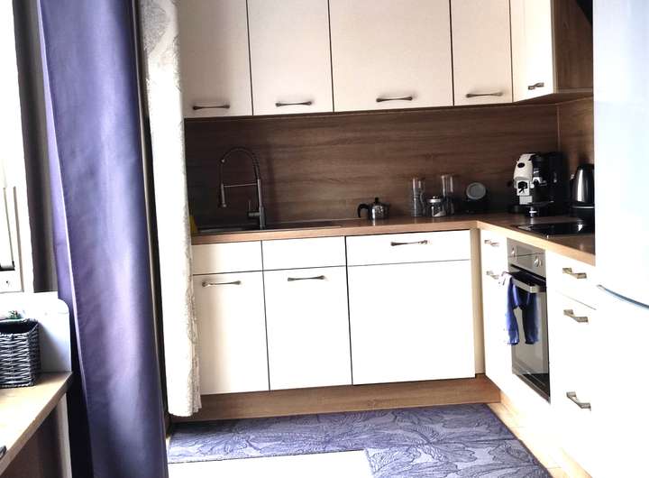 Einbauküche mit Elektrogeräten inklusive, weiteres Mobiliar auf Wunsch übernehmbar.