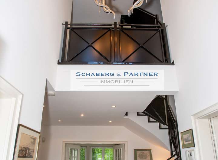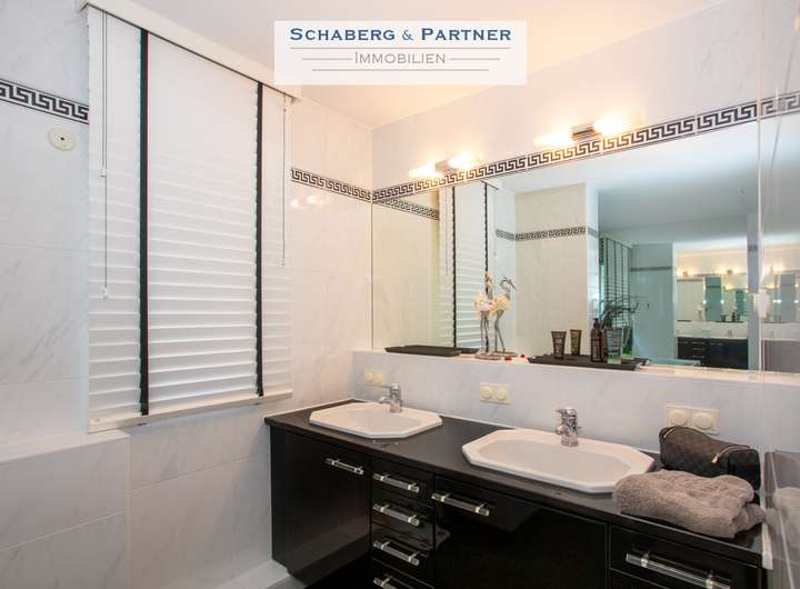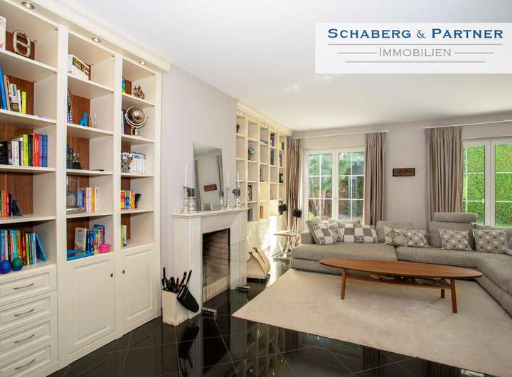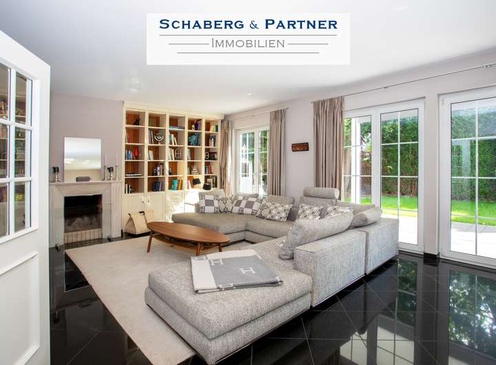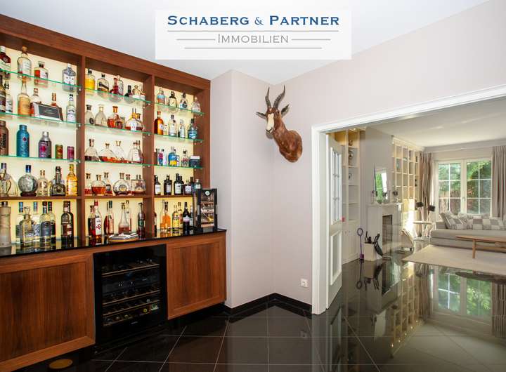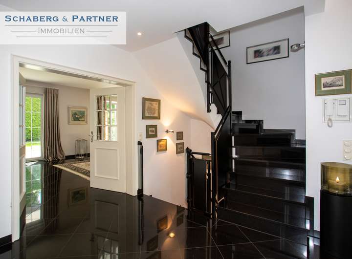 Im Erdgeschoss empfangen Sie ein repräsentativer Eingangsbereich, ein lichtdurchflutetes Wohn- und Esszimmer mit offenem Kamin, eine stilvolle Bibliothek, eine geräumige Wohnküche mit Familien-Essplatz sowie ein edler Granitboden im ganzen Haus. Maßgefertigte Türen, ein durchdachtes Lichtkonzept im Entree setzen stilvolle Akzente.