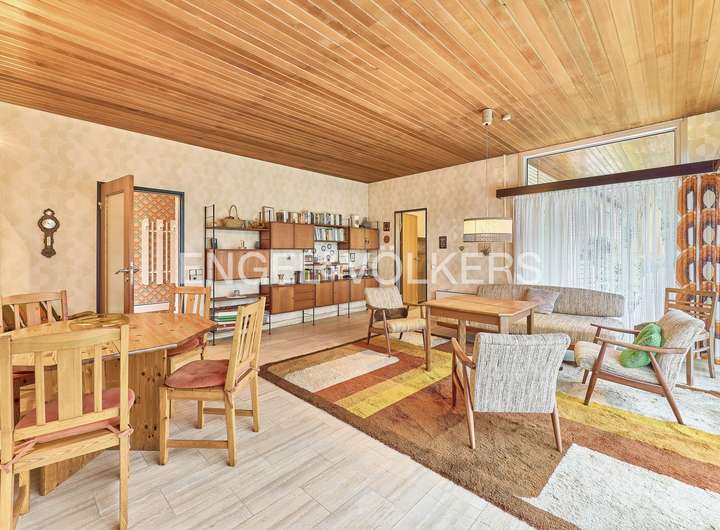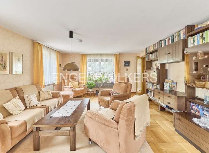 Folgt man dem Esszimmer durch das Durchgangszimmer der Raumabfolge, gelangt man zu einem weiteren großzügigen Wohnbereich mit Panoramfront zum Garten hin. Hier besticht die Deckenhöhe von ca. 2,70 Metern und bietet hervorragend die Möglichkeit zu gemütlichen Abendstunden mit der gesamten Familie oder einem Sommertag mit geöffneter Fensterfront. Mit Zugang zur Terrasse, kann dieser Bereich durch die große Fensterfront fast vollständig geöffnet werden und lässt Außen und Innen miteinander verschmelzen - Ein perfekter Ort, um die Natur zu genießen und den Alltag hinter sich zu lassen.