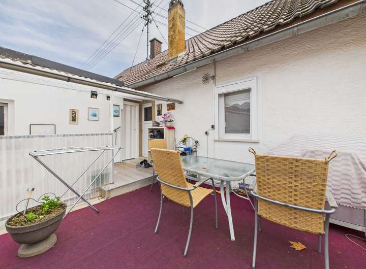 Terrasse + zusätzlicher Außenraum inkl. kleiner Küche und WC – ideal für Kochen/Grillen im Außenbereich