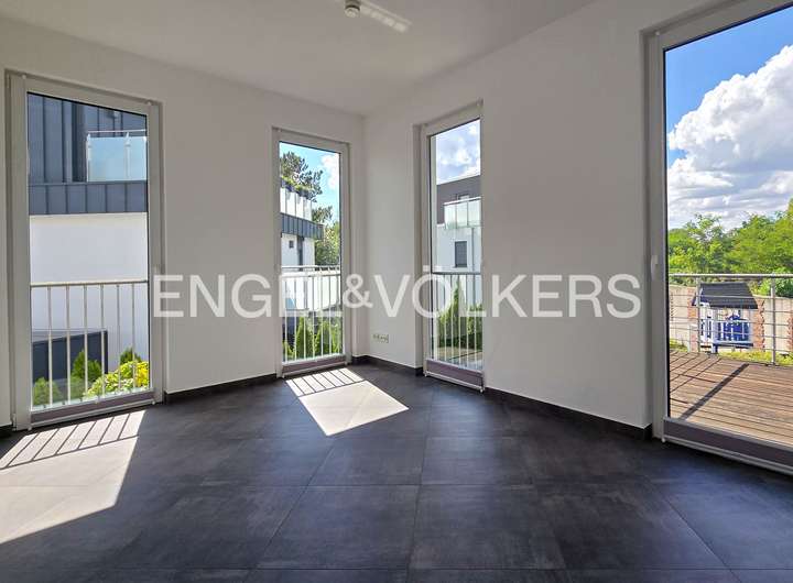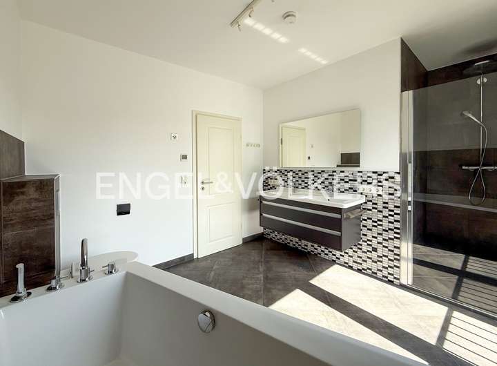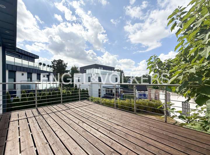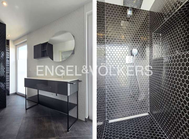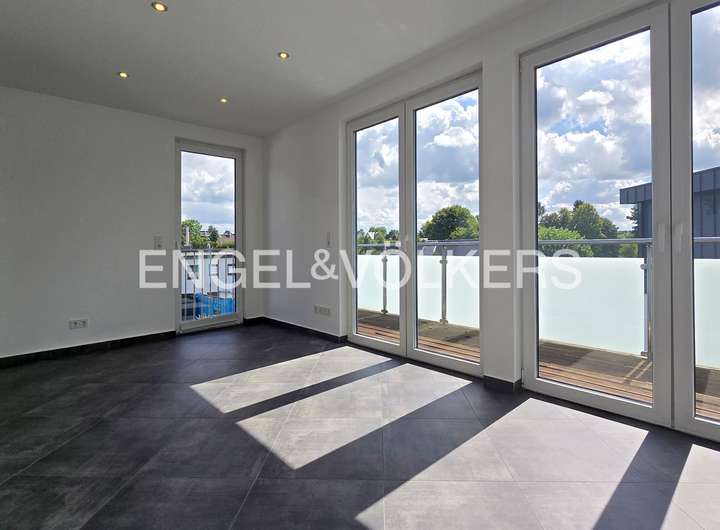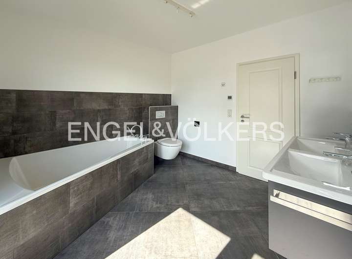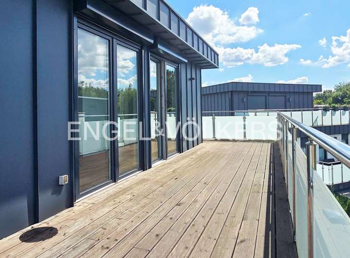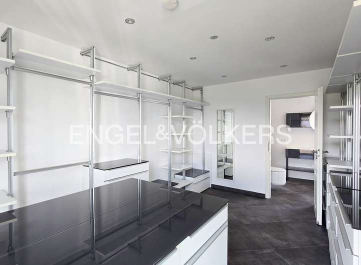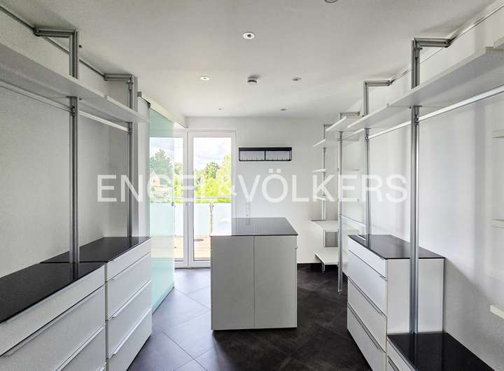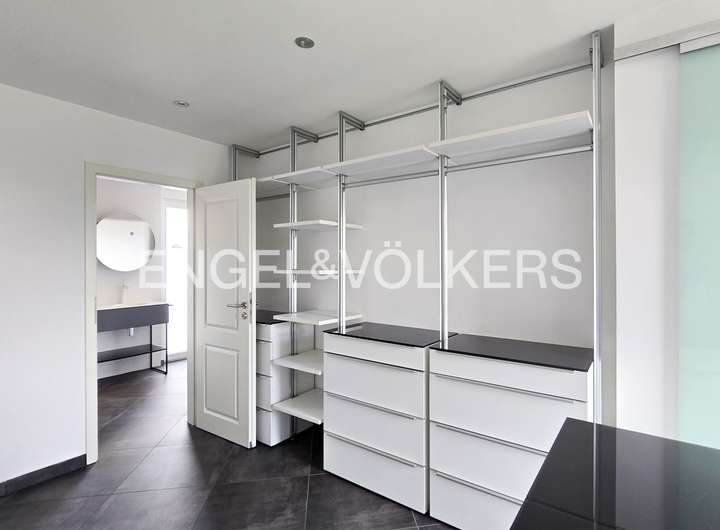 Das Staffelgeschoss überzeugt durch seine klare Architektur ohne Schrägen und mit einer modernen Raumaufteilung. Hier befinden sich ein Arbeitsbereich, ein Schlafzimmer mit angrenzendem Bad sowie eine großzügige Ankleide mit Einbauschränken. Ein besonderes Highlight ist die fast vollständig umlaufende Dachterrasse, die von der Ankleide, dem Büro und dem Schlafzimmer aus zugänglich ist – ein exklusiver Rückzugsort mit Weitblick.