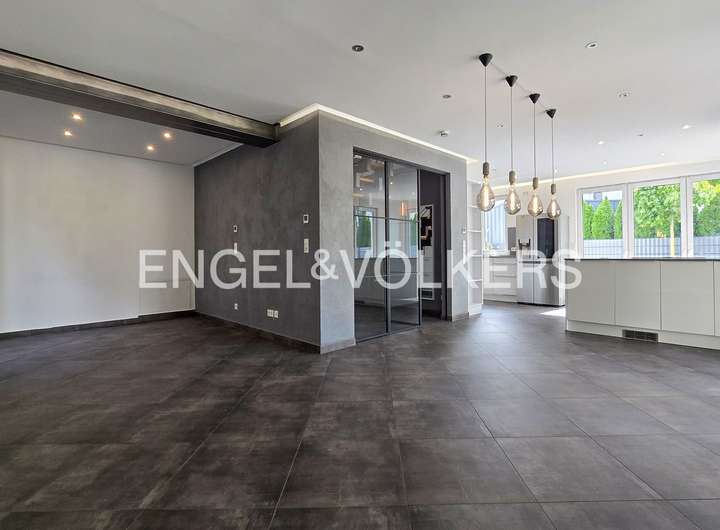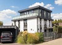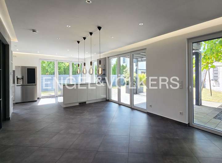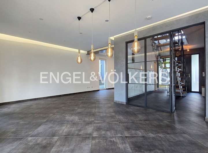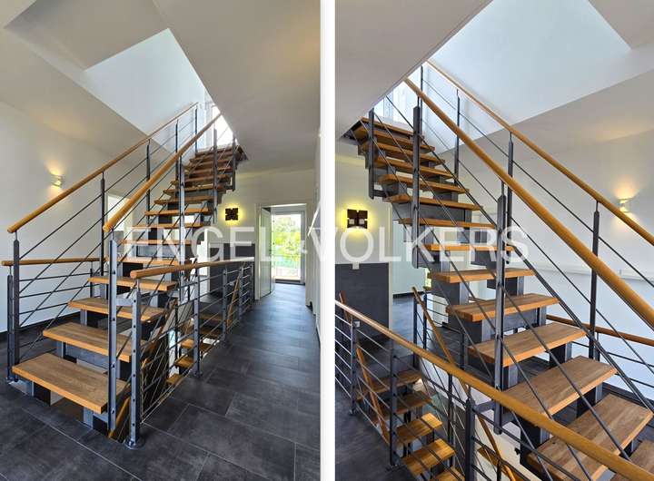 Im Erdgeschoss, hinter der Eingangstür, empfängt Sie ein großzügiges, lichtdurchflutetes Design-Treppenhaus, das den Mittelpunkt des Gebäudes bildet. Die stilvoll in der Mitte platzierte Treppe schafft eine eindrucksvolle Raumwirkung und verbindet alle Ebenen miteinander. Durch ein großes Glaselement öffnet sich der Weg in den weitläufigen Wohn- und Essbereich mit offener Küche. Hier entsteht durch zahlreiche bodentiefe Fenster eine außergewöhnliche Transparenz und Helligkeit. Der Blick führt frei in den Garten und lässt Innen- und Außenbereich nahtlos miteinander verschmelzen.