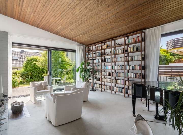 Schon beim Betreten des Hauses spüren Sie die einladende Weite der Räume, die durch die markante Pultdachform und den offen gestalteten Splitlevel-Grundriss eindrucksvoll in Szene gesetzt wird. Der Wohnbereich – das Herzstück des Hauses – beeindruckt mit hohen Decken, einem stilvollen Kamin und einem außergewöhnlichen Lichteinfall, der zu jeder Tageszeit eine warme und freundliche Atmosphäre schafft.
