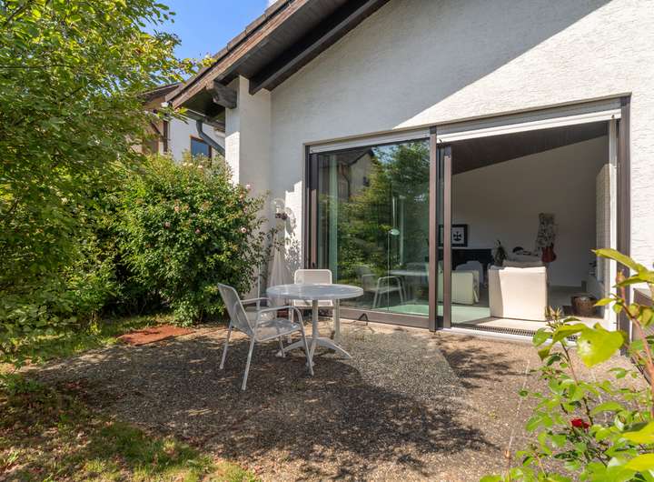 Die vorhandene Einbauküche, zwei Bäder sowie drei komfortable Schlafzimmer bilden eine solide Grundlage für Ihr neues Zuhause. Der Blick ins Grüne begleitet Sie nicht nur aus den Wohnräumen, sondern auch von der großzügigen Terrasse aus, die direkt in den liebevoll angelegten Garten führt – ein kleines Refugium für ruhige Stunden, gesellige Sommerabende oder einfach zum Durchatmen.
