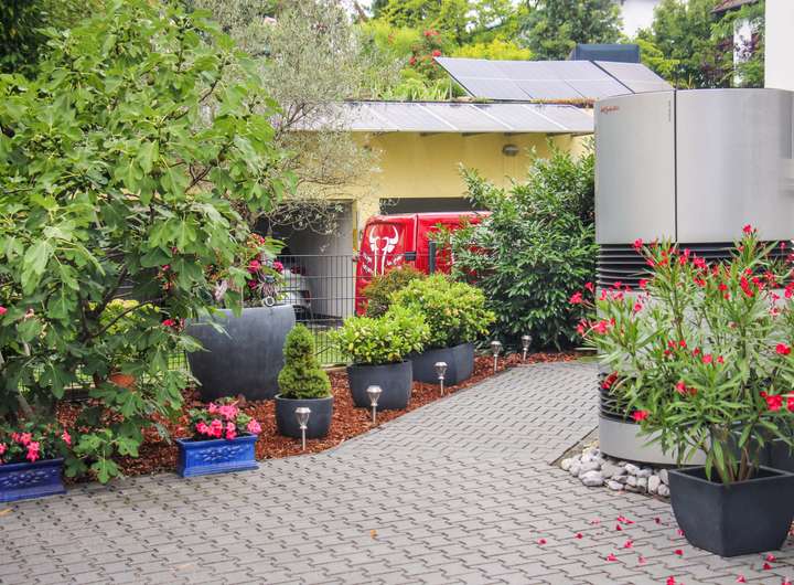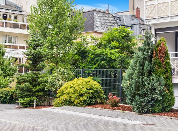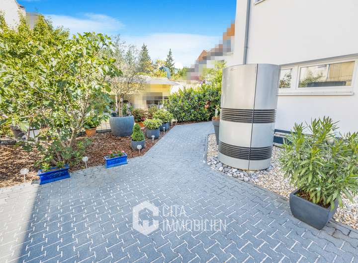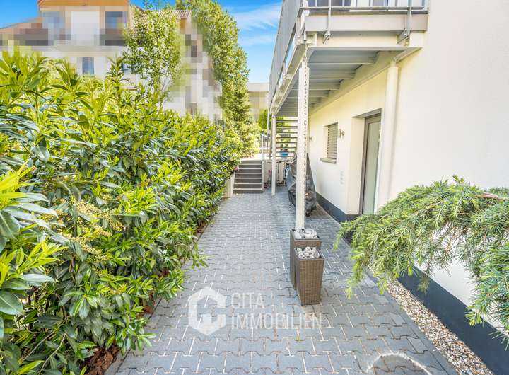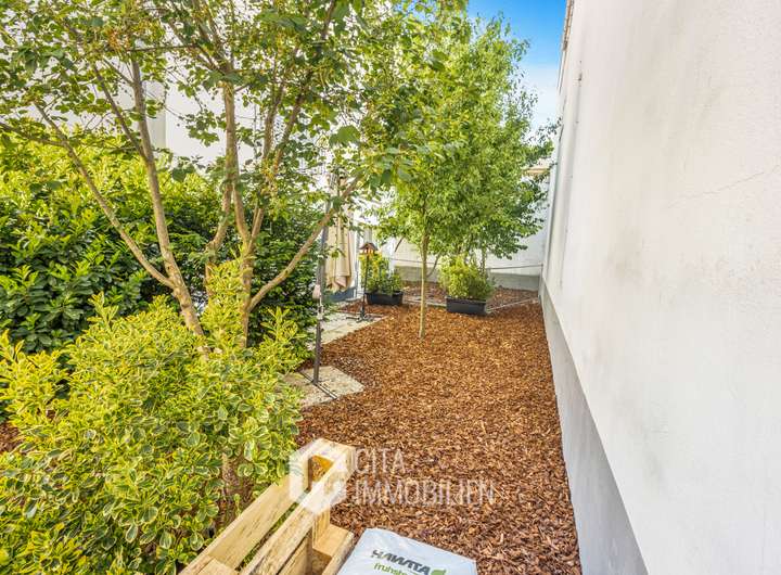 Schön gestaltete Wege und Wiesen laden zum Verweilen ein – Sie wohnen zentral und bestens angebunden und genießen zugleich Ruhe und Natur.