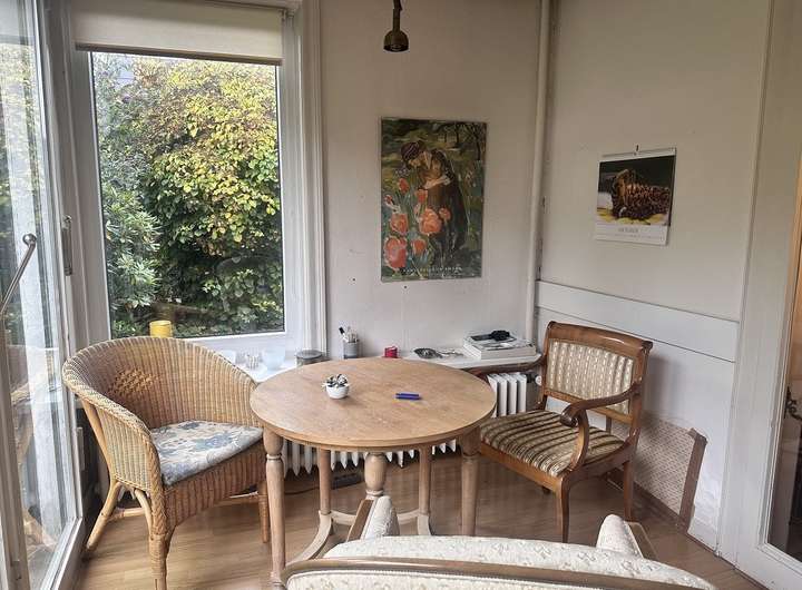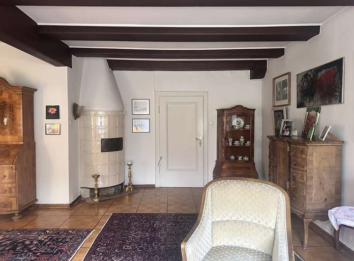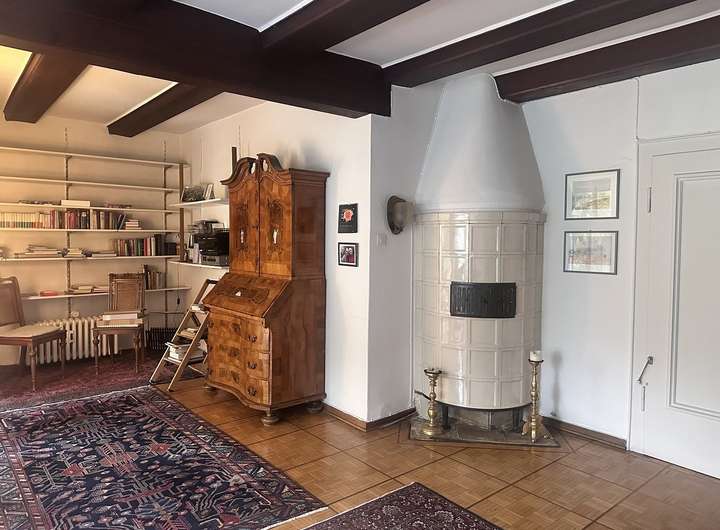 • Wohnzimmer mit stilvollem Vintage-Kachelofen und Wintergarten