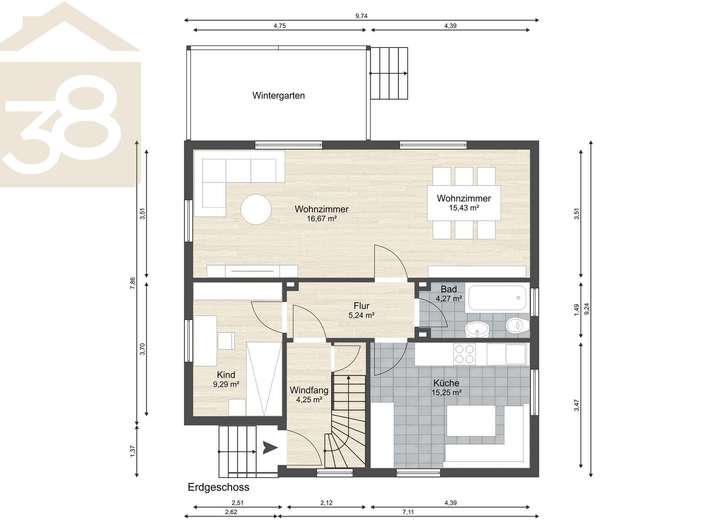 Das Erdgeschoss umfasst ein Badezimmer mit Badewanne, eine geräumige Küche mit einer Einbauküche im charmanten Landhausstil sowie ein lichtdurchflutetes Wohnzimmer mit Essbereich und angrenzendem Wintergarten. Hier können Sie entspannte Familienabende verbringen oder Gäste bewirten. Zusätzlich befindet sich ein vielseitig nutzbares Kinder-, Arbeits- oder Gästezimmer im Erdgeschoss.