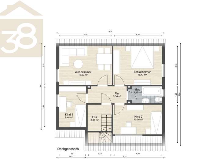 Im Dachgeschoss erwarten Sie ein Arbeitszimmer, ein Schlafzimmer und zwei weitere Kinderzimmer, die viel Raum zum Spielen und Lernen bieten. Ein weiteres Badezimmer mit Dusche sorgt für zusätzlichen Komfort.