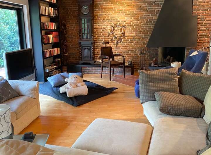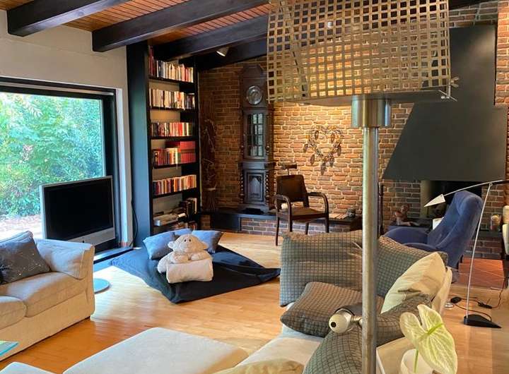 Offenem Kamin mit Stahlschürze schwarz, Klinkerwand mit handgeformten, niederländische Klinkern.