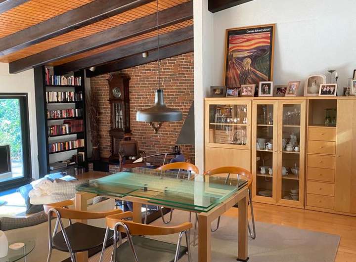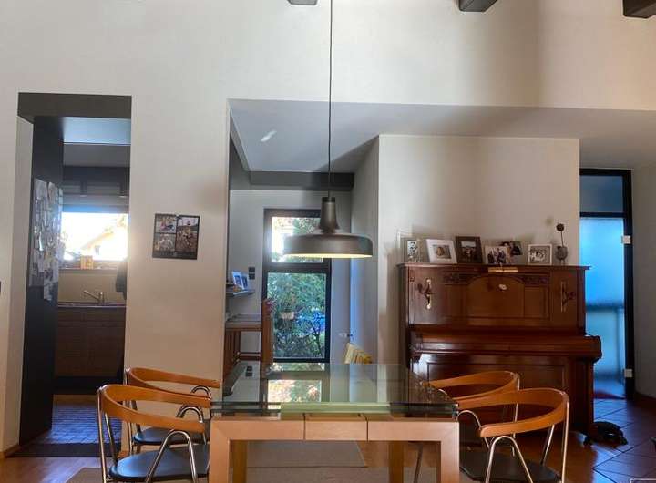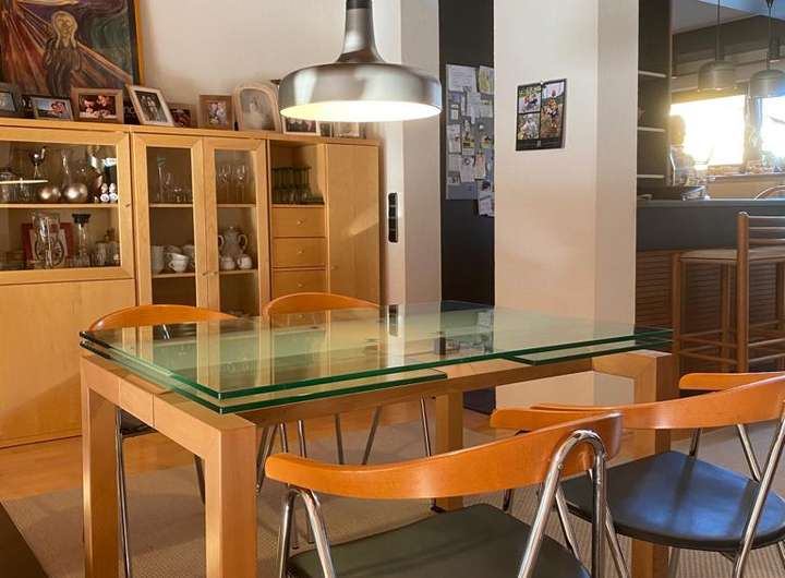 Essbereich mit offener Küche (Bulthaup C12) und Essbar zum Essbereich hin, mit Blick in den Garten.
