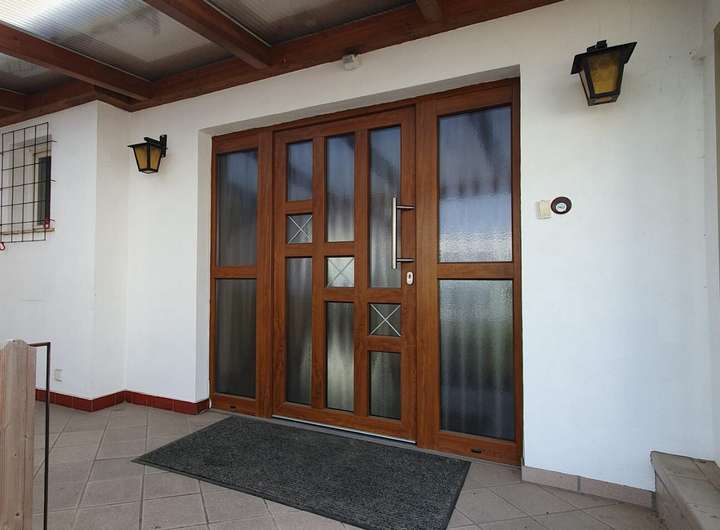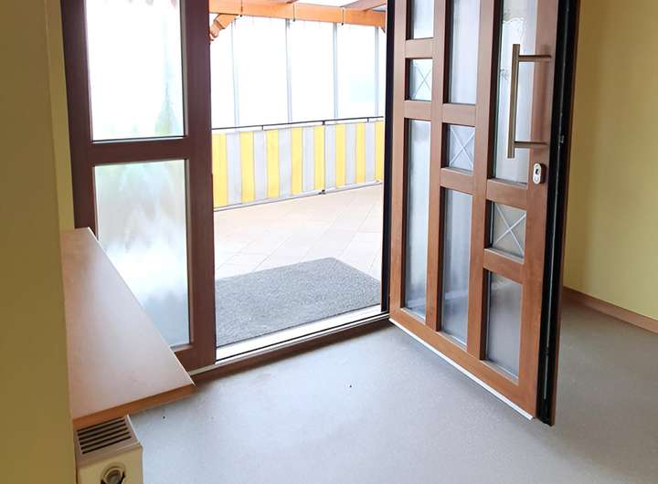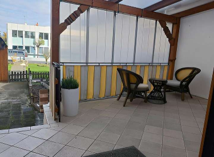 Auch Außenliebhaber kommen hier voll auf ihre Kosten: Die komplett überdachte und windgeschützte Terrasse vor dem Eingang gewährt einen gemütlichen, ungestörten Platz im Freien. Von dort aus genießen Sie den Blick in den weitläufigen Garten, der Ruhe und Privatsphäre verspricht – perfekt für entspannte Nachmittage, Spielstunden der Kinder oder laue Sommerabende mit Familie und Freunden.
