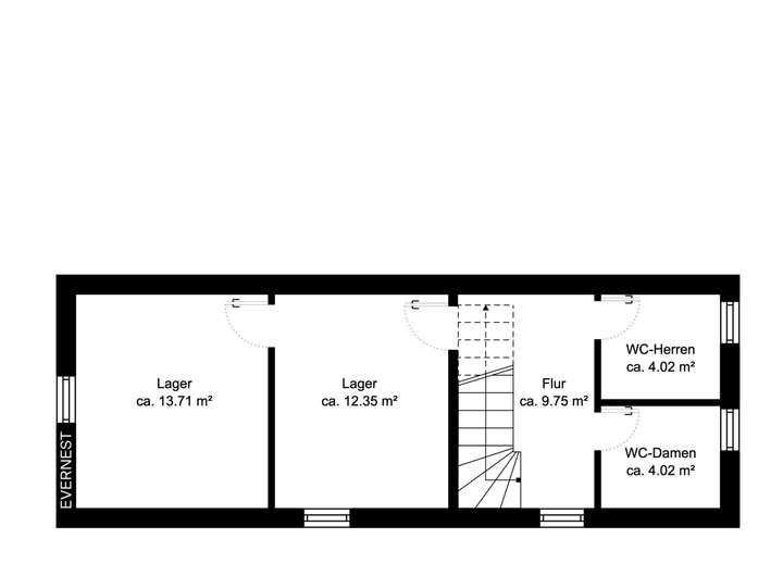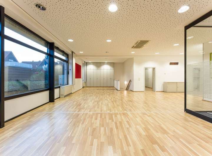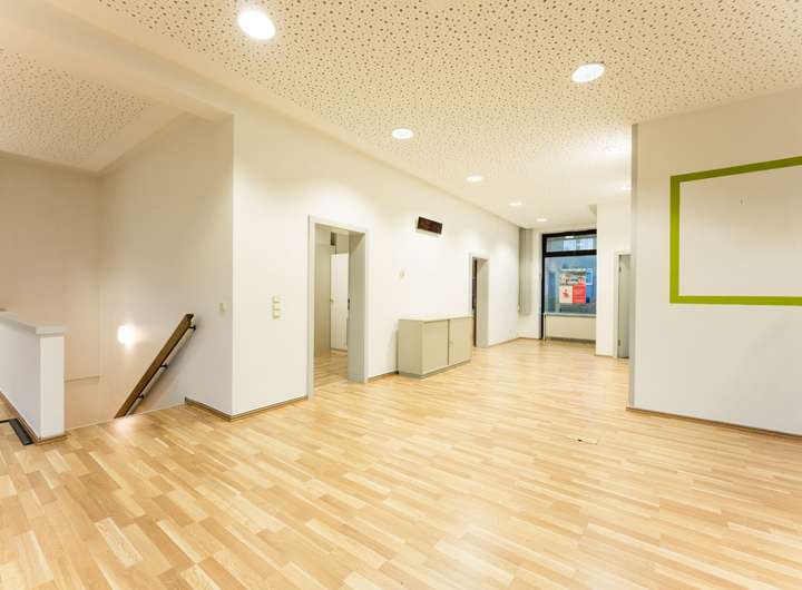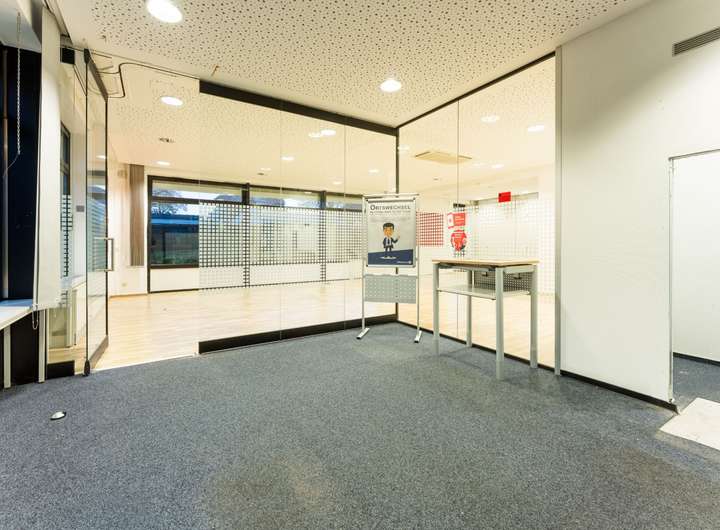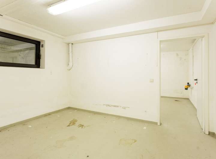 Im Erdgeschoss befinden sich der ehemalige Kundenbereich, ein Büro und ein Sozialraum sowie das SB-Foyer. Das Untergeschoss verfügt über zwei Lagerräume sowie zwei separate Mitarbeiter-WCs.