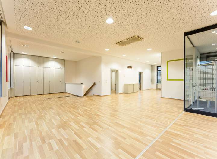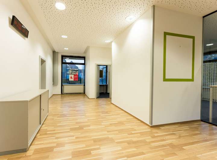 Die Immobilie präsentiert sich in einem gepflegten Zustand, im Innenbereich sorgen Aluminiumfenster mit Dreifachverglasung und eine Aluminiumeingangstür mit Glaselementen für helle Räume. Der Innenausbau besteht aus massiven und teils verglasten Trennwänden und abgehängten Rasterdecken mit integrierter Beleuchtung. Die Bodenbeläge sind überwiegend mit Laminat, Teppich und Fliesen ausgestattet.