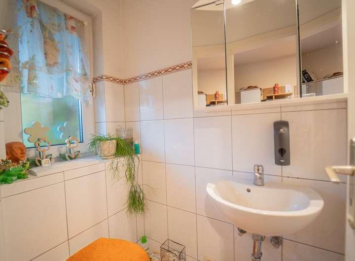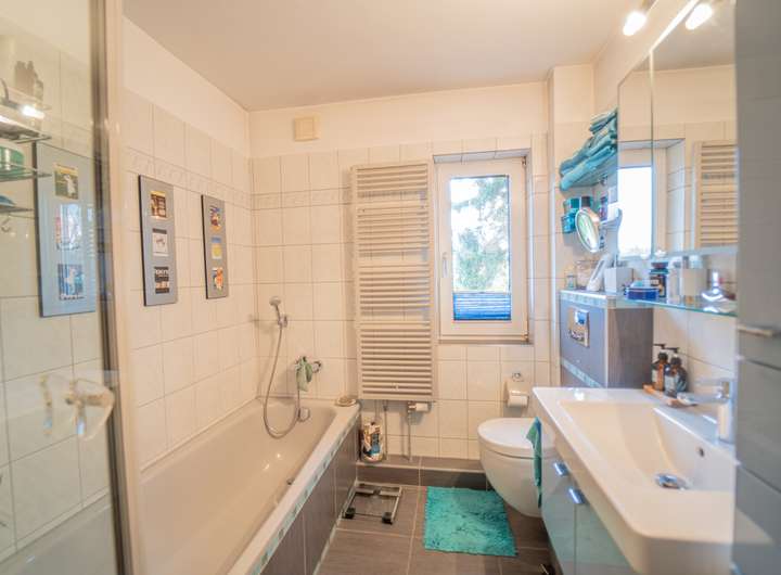 Im ersten Obergeschoss befindet sich ein großzügiges Vollbad mit Dusche sowie drei gut geschnittene Schlafzimmer, die sich ideal als Eltern-, Kinder- oder Gästezimmer eignen.