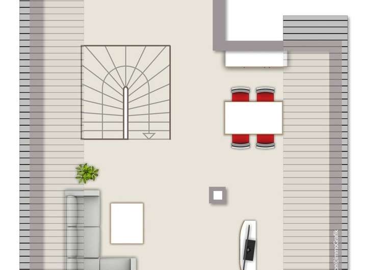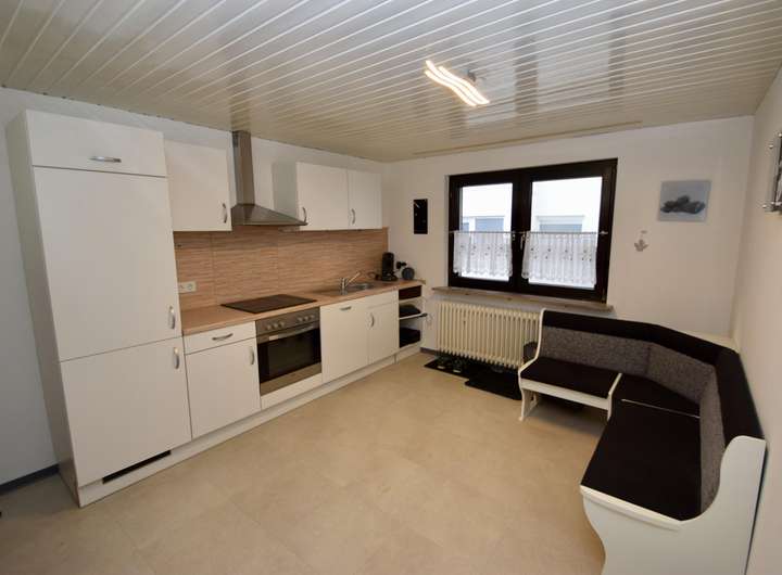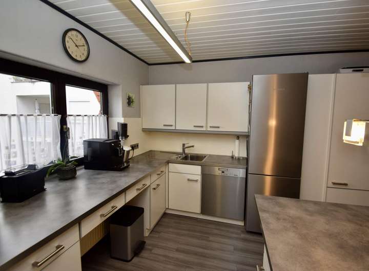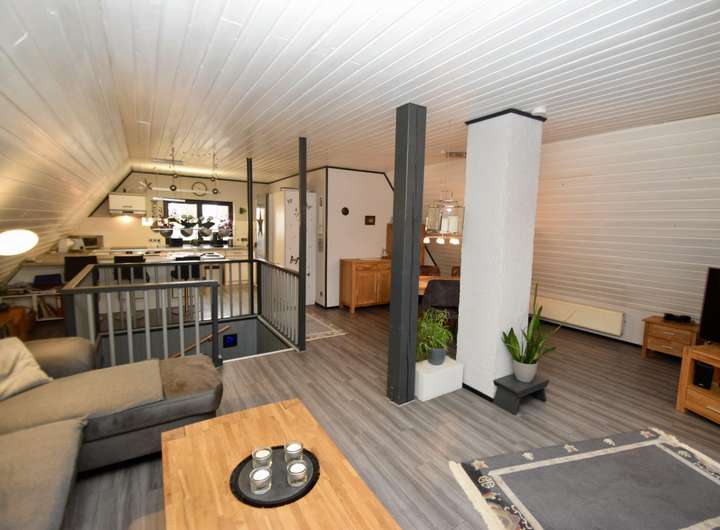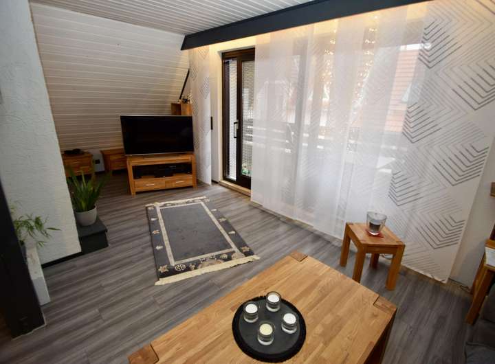 Der Wohnbereich mit offener Küche, Essecke und Wohnzimmer mit Süd-Balkon befinden sich auf einer Ebene im Dachgeschoss.