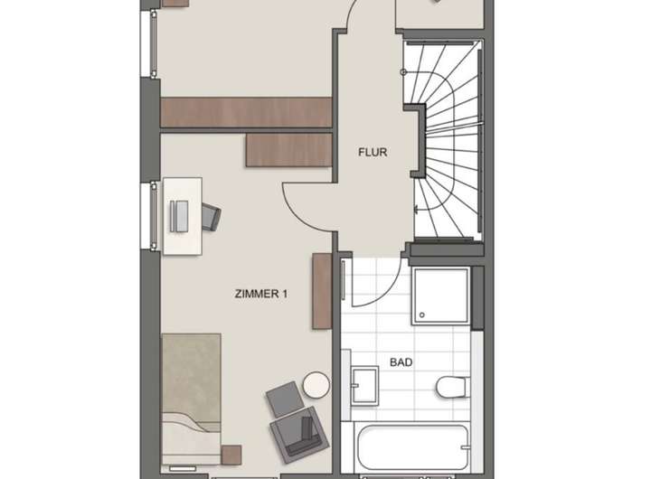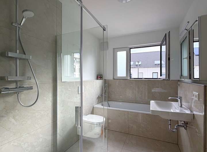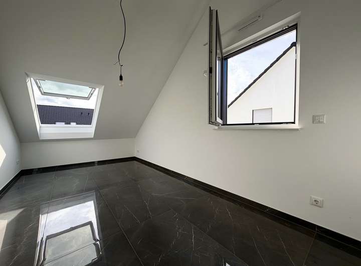 Im ersten Obergeschoss erwartet Sie ein großzügiges Schlafzimmer, ein weiteres Zimmer, das sich ideal als Kinder-, Arbeits- oder Gästezimmer eignet, sowie ein stilvolles Masterbad mit begehbarer Dusche und Badewanne. Das ausgebaute Dachgeschoss bietet drei weitere, flexibel nutzbare Zimmer. Eines davon kann bei Bedarf zu einem zusätzlichen Badezimmer umgestaltet werden – die notwendigen Leitungen und Anschlüsse sind bereits vorbereitet. Das Haus ist nicht unterkellert, verfügt jedoch über ausreichend Stauraum und eine durchdachte Grundrissgestaltung.