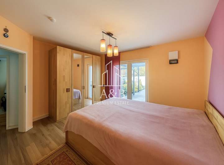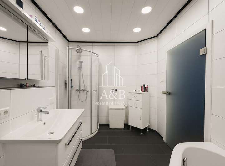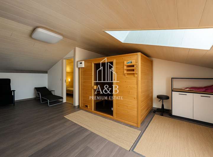 Ein besonderes Highlight befindet sich im Dachgeschoss (ca. 20 m²): ein hochwertig gestalteter Wellnessbereich mit eingebauter Sauna, separatem Badezimmer mit Dusche und WC.