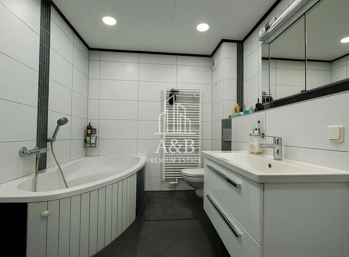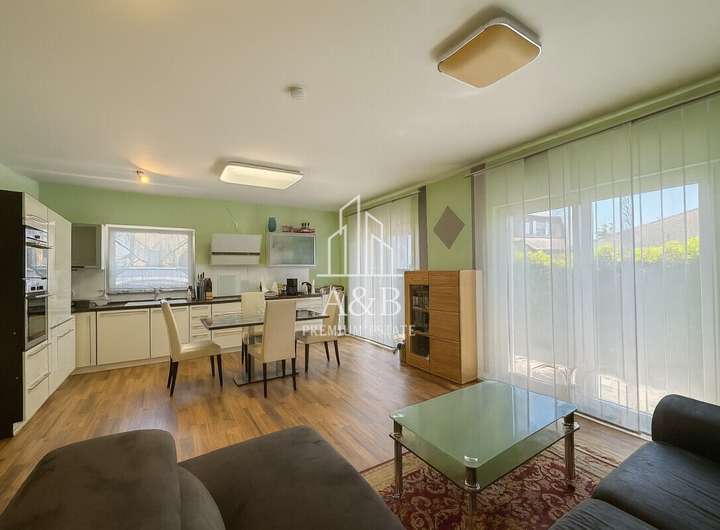 Die Erdgeschosswohnung (ca. 81 m²) bietet eine offene, lichtdurchflutete Wohnatmosphäre mit einem großzügigen Wohn- und Essbereich samt offener Küche (zzgl. 20.000 €). Der direkte Zugang zur sonnigen Terrasse und dem gepflegten Garten mit Gartenhaus macht diese Einheit besonders attraktiv. Das hochwertig ausgestattete Badezimmer verfügt über eine Dusche sowie eine Badewanne. Ein zusätzlicher Komfort: Direkt angrenzend an den Garten befindet sich der Heizraum, der nicht nur die effiziente Luft-Wärmepumpe beherbergt, sondern darüber hinaus über eine Toilette und ein Waschbecken verfügt – ideal für Ihre Gäste bei der nächsten Gartenparty!