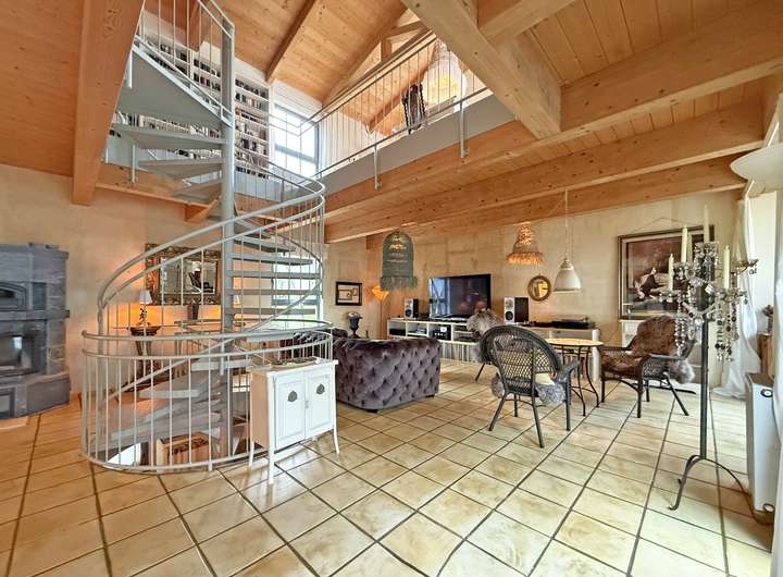 Dieses außergewöhnlich gestaltete Einfamilienhaus überzeugt durch seine offene Architektur, die modernen Wohnkomfort mit einem ganz besonderen Wohngefühl verbindet. Bereits beim Betreten des Hauses wird die außergewöhnliche Atmosphäre spürbar. Hier treffen mediterrane Elemente auf modernes Industriedesign. Die Wendeltreppe, die alle Ebenen verbindet, verleiht diesem Objekt den ganz besonderen, modernen Charakter, während die französischen Terracottafliesen und Holzböden den behaglichen Kontrast hervorheben.