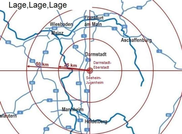 Darmstadt (ca.161.000 Einwohner, Stand: 2018) ist eine kreisfreie Stadt im Süden Hessens, Verwaltungssitz des Regierungsbezirks Darmstadt und des Landkreises Darmstadt-Dieburg. Die Stadt gehört zum Rhein-Main-Gebiet und bildet eines der zehn Oberzentren des Landes Hessen. Darmstadt ist nach Frankfurt am Main, Wiesbaden und Kassel die viertgrößte Stadt des Landes Hessen. Die nächstgelegenen größeren Städte sind Frankfurt am Main, etwa 30 km nördlich, Wiesbaden und Mainz, etwa 40 km nordwestlich, Mannheim, etwa 45 km sowie Heidelberg etwa 55 km südlich.