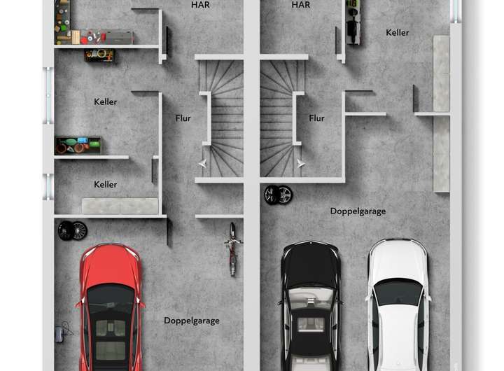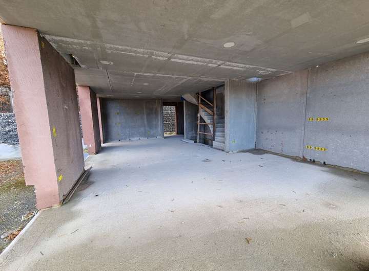 Das Untergeschoss umfasst mehrere Abstellräume, den Technikraum mit Platz für Wärmepumpe, Waschmaschine und Trockner, sowie eine großzügige Doppelgarage mit elektrisch betriebenem Sektionaltor und Fernbedienung. Davor befinden sich noch zwei Pkw-Stellplätze.