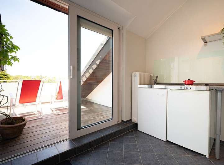 -Dachbalkon mit hochwertigem Unterbodenschutz und Tropenholzbelag, Balkon-Sichtschutz aus satiniertem Glas