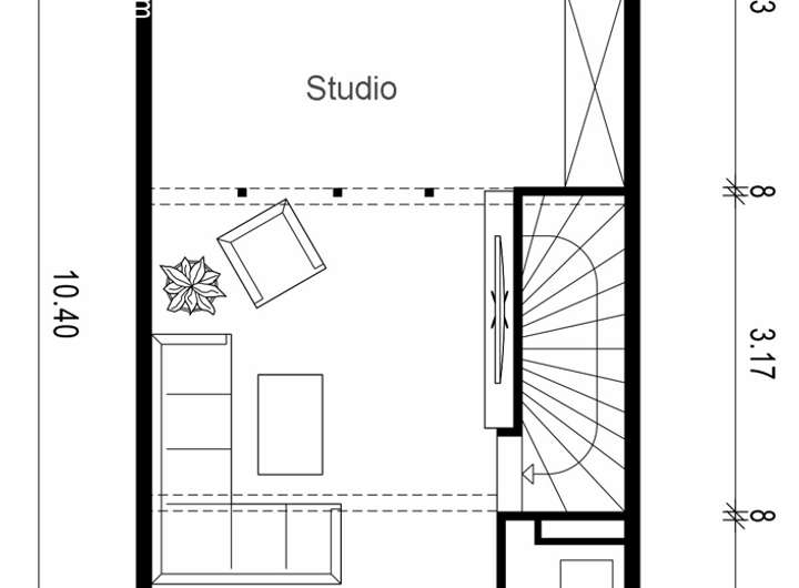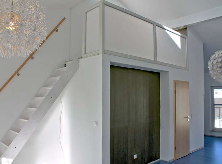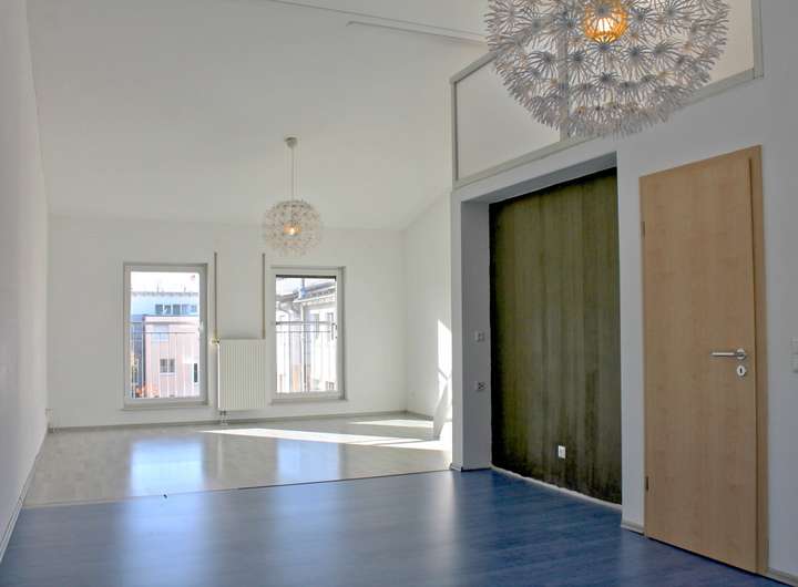 Das Dachstudio ist derzeit ein großer Raum mit enormer Raumhöhe bis in die Spitze. Sehr viel Licht und Platz sind hier vorhanden. Bei Bedarf kann hier auch noch ein eigenes Bad entstehen.