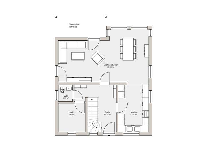 4 Zimmer, offene Küche, Diele, WC, Flur, Bad, Hauswirtschaftsraum, überdachte Terrasse