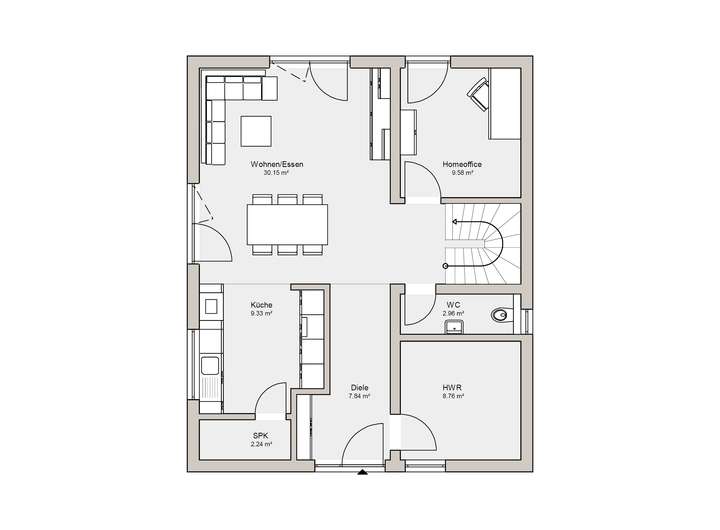 Das Erdgeschoss erstreckt sich über 70 m². Aufgeteilt ist es in einen großen Wohn- und Essbereich mit offener Küche und Speisekammer, ein WC, Diele und ein Home-Office, welches alternativ auch als Gästezimmer genutzt werden kann. Der Hauswirtschaftsraum befindet sich ebenfalls im Erdgeschoss und lässt sich über die Diele betreten.