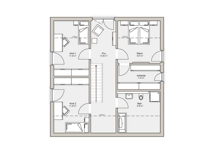 Die Treppe führt in die oberen Flur, der besonders geräumig gestaltet ist und in der Gaube Platz für eine gemütliche Leseecke bietet. Zwei gleichgroße Kinderzimmer, ein Familienbad und ein Elternschlafzimmer mit Ankleide komplettieren das Dachgeschoss. Hier kann man sich wohlfühlen!