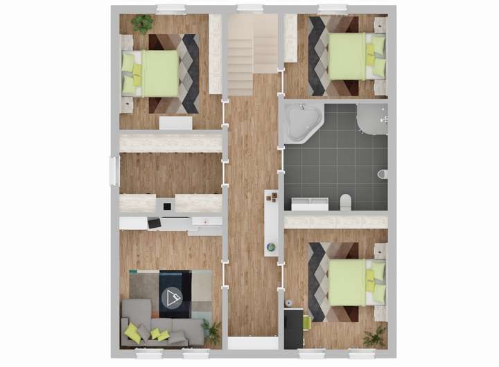 • Obergeschoss: 4–5 Zimmer mit flexiblem Nutzungskonzept (z. B. Schlafräume, Kinderzimmer oder Gästezimmer), Badezimmer erneuert 2005