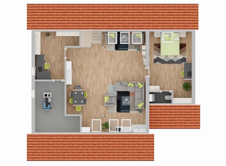 • Dachgeschoss: charmantes Studio mit offenem Charakter, zusätzlich Büro- oder Arbeitsbereich, weitere Schlafmöglichkeiten sowie separates WC