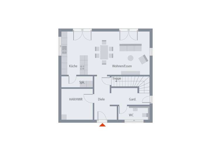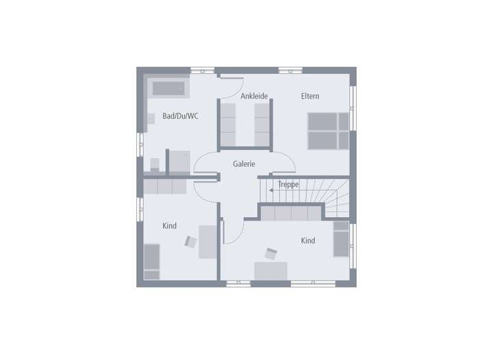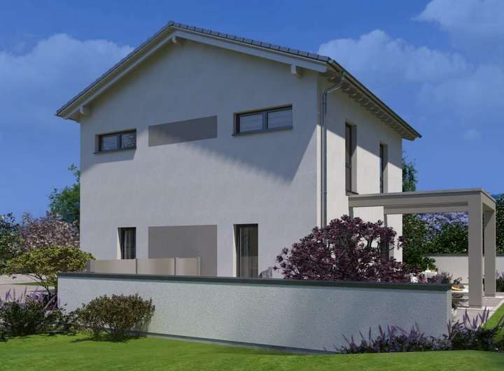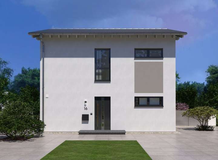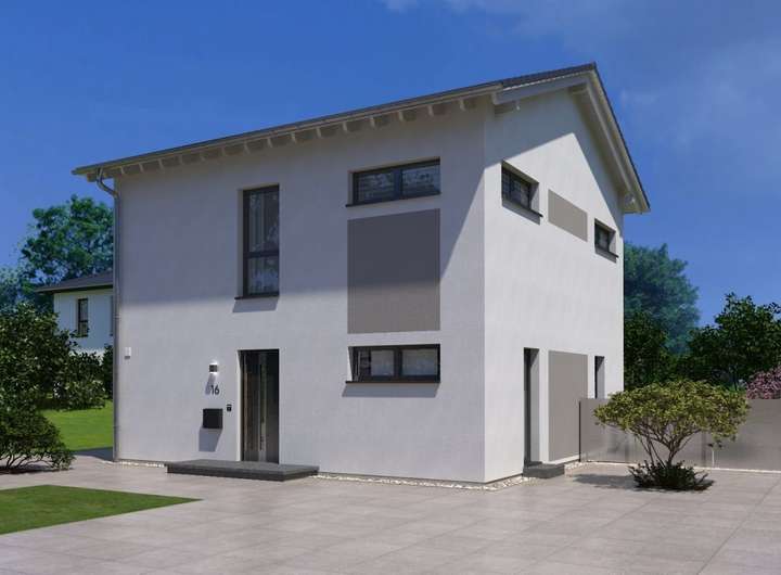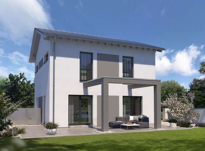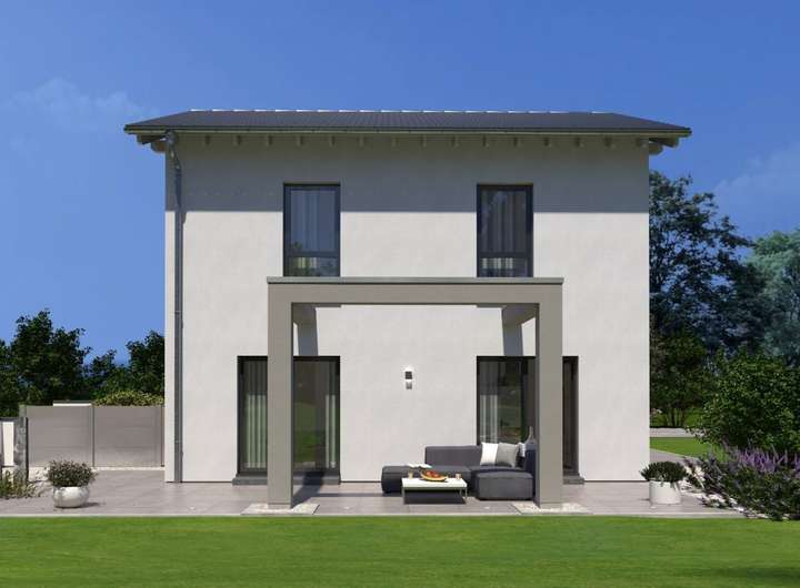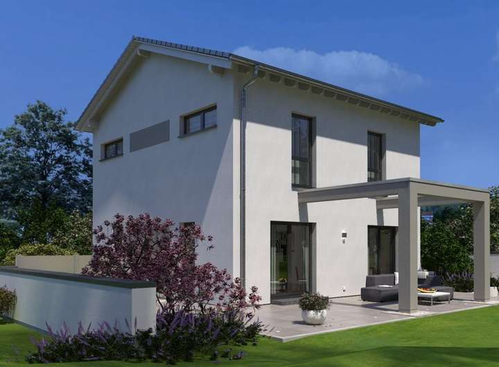 Zeitlos elegant, praktisch und komfortabel - so präsentiert sich unsere Stadtvilla 14. Das Satteldach verleiht dem Gebäude einen besonderen Charme und sorgt dafür, dass es sich perfekt in jedes Wohnumfeld einfügt. Doch auch im Inneren hat das Haus auf einer Wohnfläche von über 140 m² viel zu bieten: Der große und helle Wohn-Koch-Essbereich bildet das Herzstück des Erdgeschosses. Von hier aus ist auch der Zugang zu einer überdachten Terrasse möglich, die wie eine Fortsetzung des Wohnbereichs anmutet. Abgerundet wird das Raumangebot durch eine praktische, weil direkt an die Küche angrenzende Speisekammer, einen geräumigen Hauswirtschaftsraum sowie ein Gäste-WC. Von der großen Diele mit separatem Garderobenbereich führt eine halbgewendelte Treppe ins Obergeschoss - und direkt in die kleine, aber feine Galerie, von der es direkte Zugänge in die vier Räume gibt: zwei Kinderzimmer, ein großes Bad mit Wanne, Dusche und WC sowie den Bereich der Eltern mit Schlaf- und Ankleidezimmer.