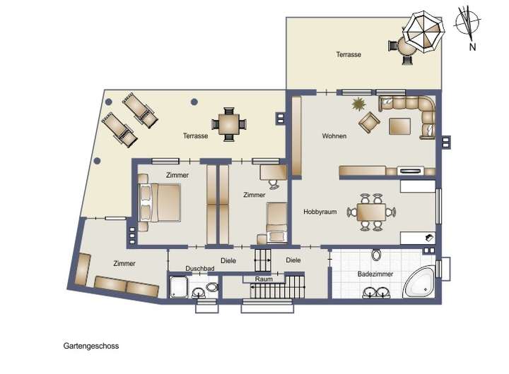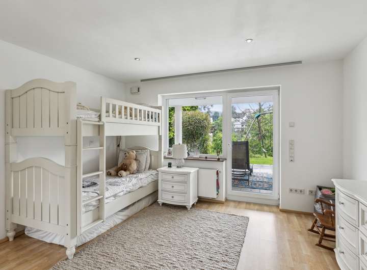 Drei Schlafzimmer, großzügiges Wohnzimmer mit Zugang zu überdachter und offener Terrasse, offene Küche, Tageslichtbad, Gäste-WC, direkter Gartenzugang.
