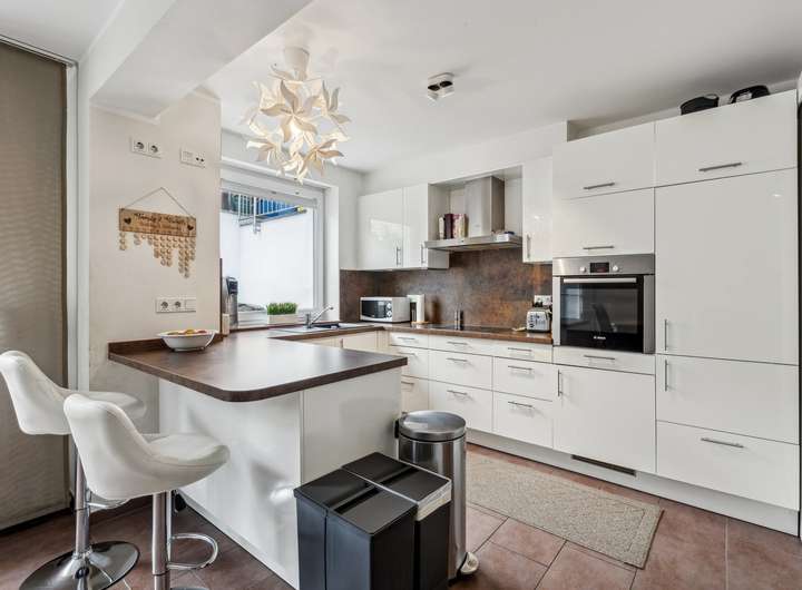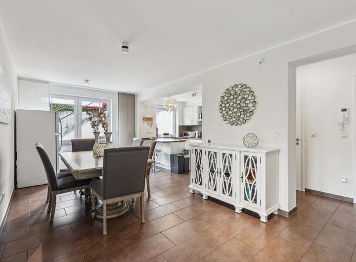 Zwei Schlafzimmer, lichtdurchflutetes Wohnzimmer mit Balkonzugang, moderne Einbauküche, Tageslichtbad, Gäste-WC.